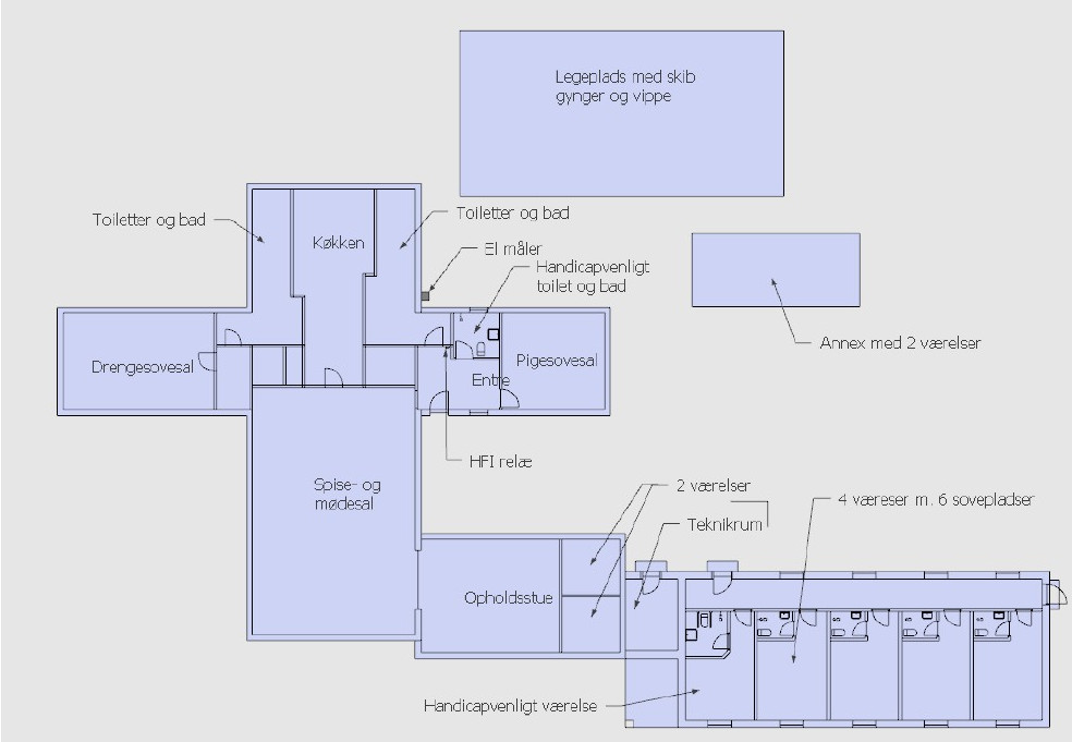 Værelsesfløj (ny 2016) indrettet med 5 værelse og fælles gangareal.